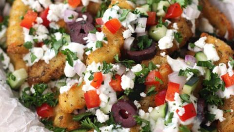 Upgrade your next batch of frozen fries with fresh veggies, crumbled feta, and a tangy Greek yogurt sauce for a healthier treat that's sure to please.