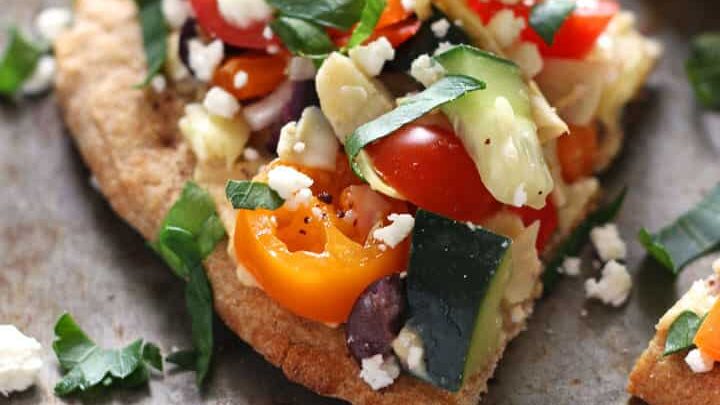 Chewy naan flatbread smothered in creamy hummus and topped with crispy veggies is a great pizza alternative. A sprinkle of salty feta cheese makes it taste extra special.