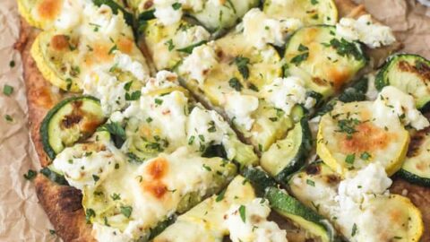 Perfect for using up summer squash, the secret to making this veggie pizza super EASY is using a premade flatbread.