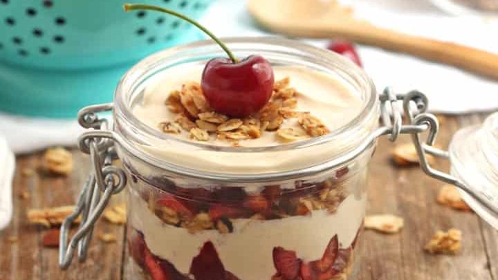 The star of these parfaits is the coffee Greek yogurt. It’s made with a little instant espresso powder and maple syrup.