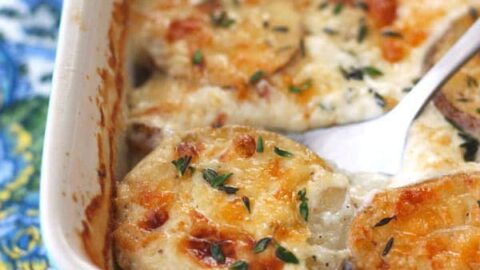 Thin potato slices are baked until tender in an herby cream sauce and topped with bubbly melted cheese. The results are heavenly.