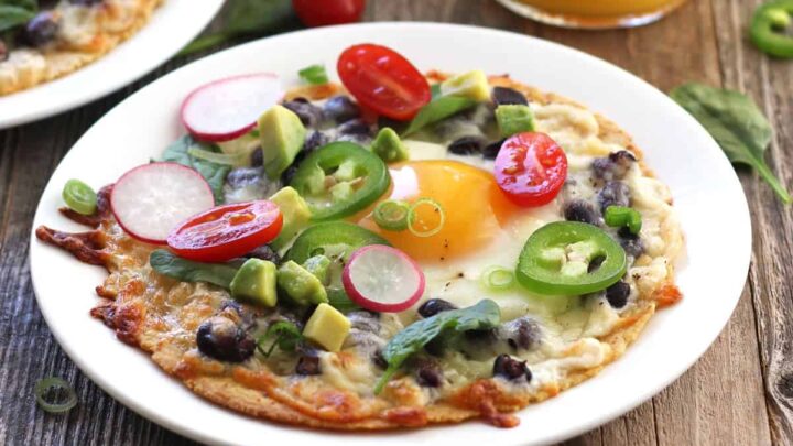 These breakfast tostadas feature a corn tortilla topped with black beans, cheese, and an egg that’s cooked to your liking.