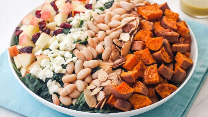 It’s made with a mix of hearty kale, crunchy apple pieces, and the best smoky roasted sweet potatoes. Plus a sprinkle of feta, almonds, and dried fruit for a salty-sweet flavor.