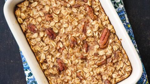 When I need something simple but comforting, this baked oatmeal is my go-to recipe. It smells like banana bread but is full of hearty oats, nuts, and ground flaxseeds.