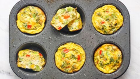 The easy recipe makes 6 frittatas and is excellent for using up leftover ingredients. You can swap the veggies and cheese for whatever you’ve got on hand.