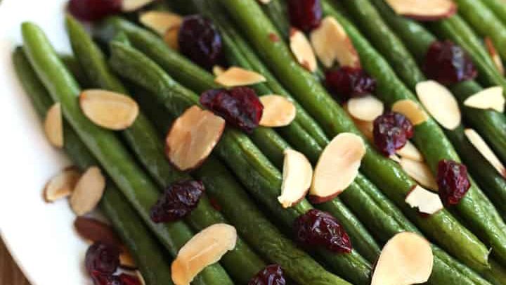 A pinch of red pepper flakes adds an unexpected spicy kick to roasted green beans topped with sweet dried cranberries and crunchy toasted almond slices.