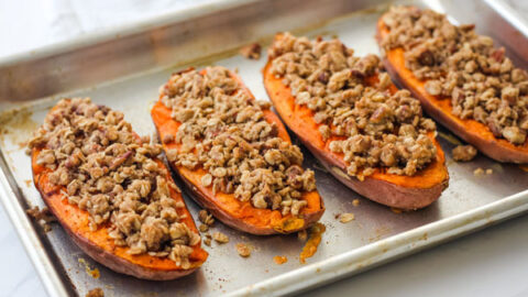 The buttery oat and pecan streusel take these creamy baked sweet potatoes over the top. Bonus: you can cook them ahead of time and reheat just before serving.