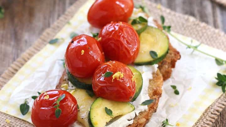 A delightful dinner for two of toasted crusty bread spread with goat cheese or hummus and topped with savory roasted vegetables.