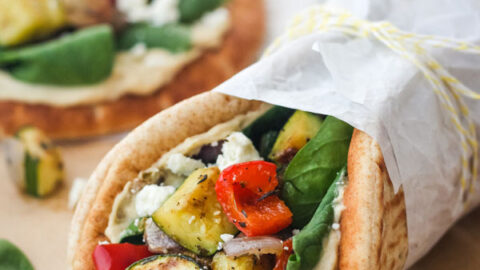 Warm pitas with hummus, feta, and savory roasted vegetables. Perfect for lunch or a light dinner for two!