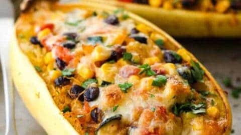 A hearty vegetarian dinner for two of roasted spaghetti squash halves stuffed with a flavorful southwestern veggie and cheese filling.